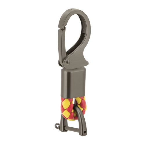 Llavero con mosquetón de seguridad con cierre de grillete y diseño de inspiración naútica. Disponible en varios colores: rojo, azul, negro y rojo/amarillo de la bandera de España.