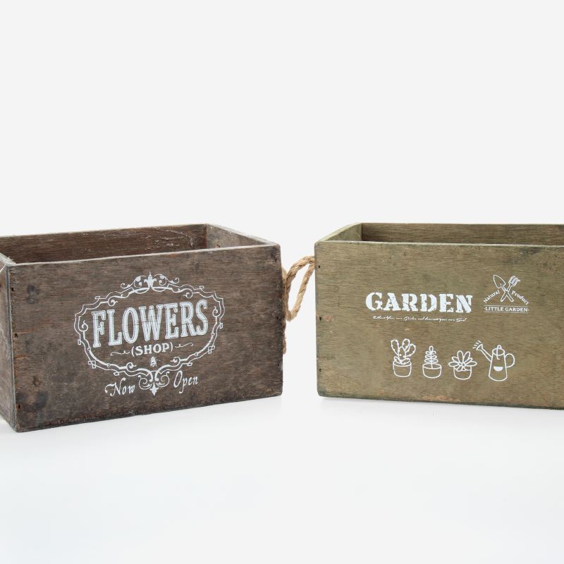 Original macetero de madera con asas de cuerda. Su diseño le dará un toque decorativo muy actual a cualquier rincón de tu casa, jardín o terraza. También es ideal para decorar cualquier evento al aire libre. Disponible en dos modelos surtidos.